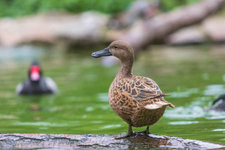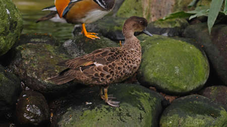Close up shot of wild brown duck sitting on rock. Pond bird in resting pose, waterfowl in safari park