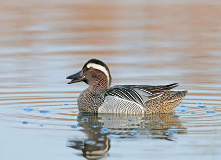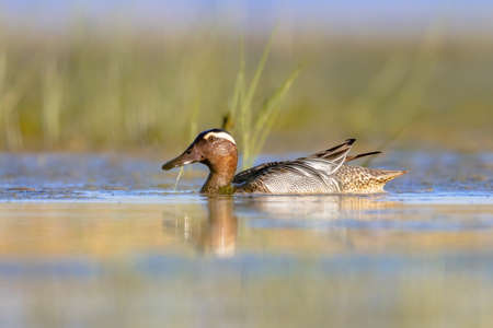 Garganey (Spatula querquedula) is a small dabbling duck. Male bird swimming in Wetland during Migration. Wildlife Scene in Nature of Europe.