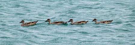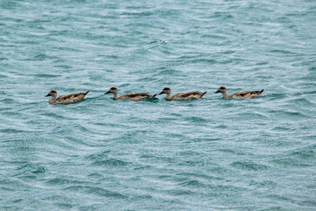 Duck family swimming at atlantic ocean near cerro avanzado beach, puerto madryn, chubut province, argentina