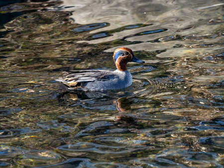 A male eurasian teal duck, Anas crecca, floats in the Hikiji River in Yamato, Japan.