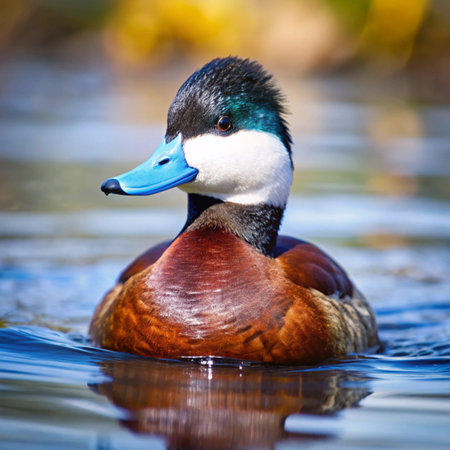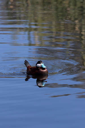 Colorful ruddy duck with its bright blue beak has a clear reflection in the reclaimed water of Sweetwater Wetlands in Tucson