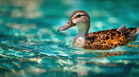 A stunning close-up image of a duck gracefully swimming in clear turquoise water. The vibrant feathers and serene environment create a peaceful wildlife scene.