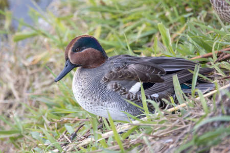 Green-winged Teal - Anas crecca, beautiful colorfull small duck from Euroasian fresh waters, Zug, Switzerland.
