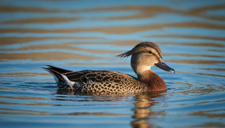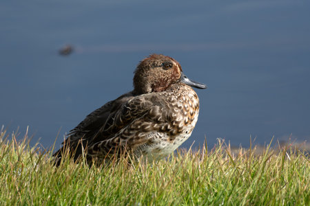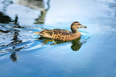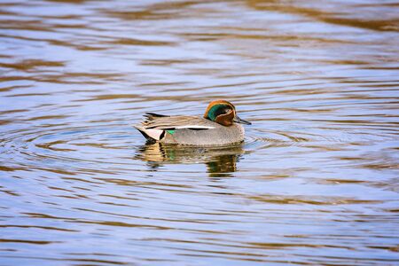 Eurasian Teal female (Common Teal) (Anas crecca) or Green-winged Teal close up at sunset.