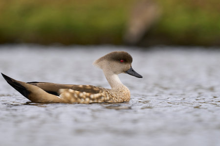 Eider duck swimming on a body of water in the Atacama Desert in front of green grass.