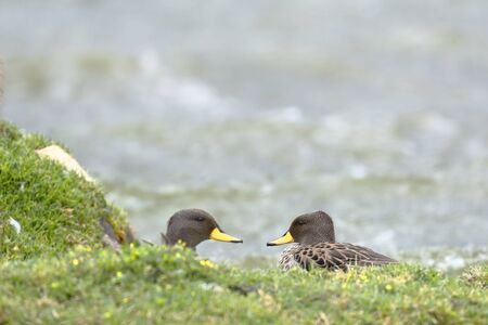 Pair of ducks (anas flavirostris) leaning cautiously among the grass