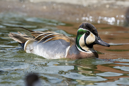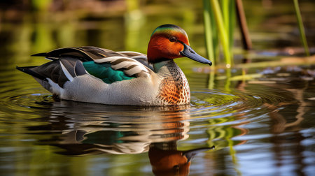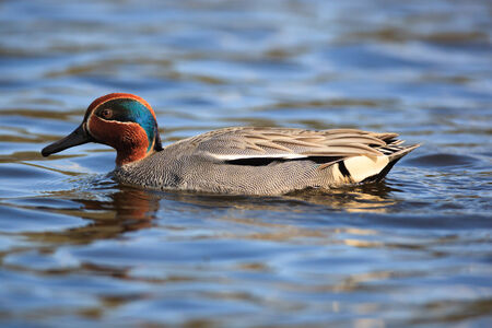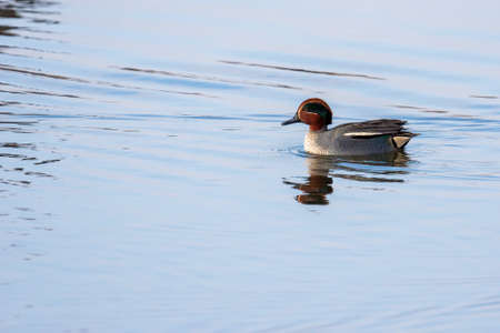 Duck swims on the surface of the water in search of food. The Alzavola belongs to the Anatidae family and is a duck with extremely variegated and shimmering plumage, which reveals its true nature in contact with water, where it proves to be agile and fast.