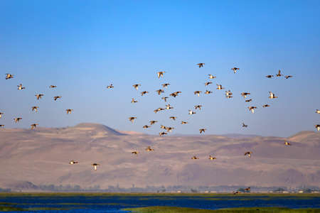 Northern Pintail, Anas acuta birds in flight on the sky