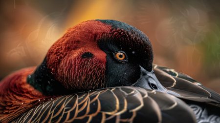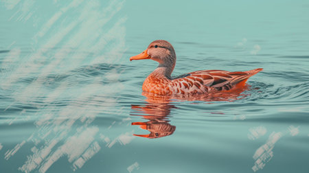 a duck gracefully swims in the water, showcasing a stunning combination of dark orange and light cyan colors. the solarization effect adds a unique touch to the image, enhancing the nature-based patterns on the duck's feathers. the contrasting shades of light maroon and sky-blue create a captivating visual. this wildlife photography captures the duck's nature-inspired camouflage, making it a mesmerizing sight. explore this captivating image
