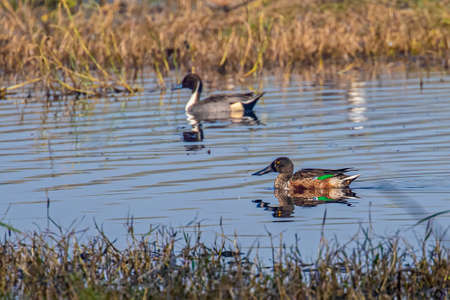 Female Northern Shoveler (Anas acuta) swimming in the water.