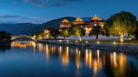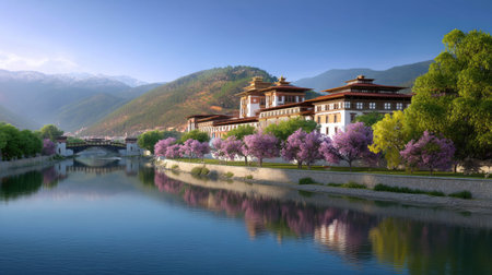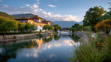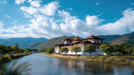 A stunning representation of traditional Bhutanese architecture set against a tranquil river, mountains, and a vibrant blue sky filled with clouds.