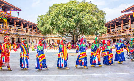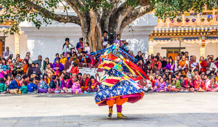 masked dancers at drupchen festival in the dzong of Punakha, Bhutan Drupchen festival is taking place yearly in march In the background are bhutanese spectators, watching the performance