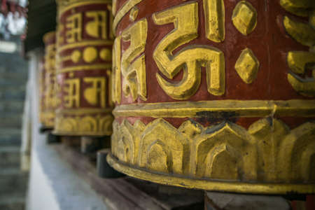 Turning prayer wheels mantra in Bhutan with traditional writing mantra which sounds as Om mani padme hum, literally means 'Oh, jewel in the lotus'