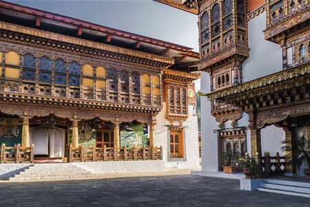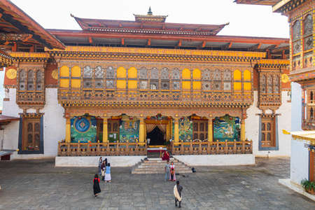 Bhutan - October 24, 2021: Inside Punakha Dzong in Bhutan. Punakha Dzong Monastery, one of the largest monasteries in Asia. The delicate decoration inside of punakha dzong, Bhutan. traditional