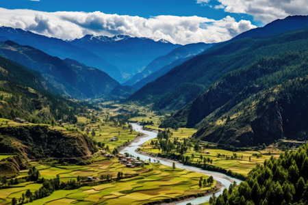 Terraced rice fields in the Himalayas, Nepal, Panorama top view of Paro Valley landscape, Bhutan, AI Generated