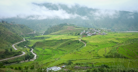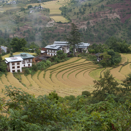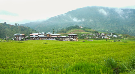 Paddy rice field with rural houses at the Sopsokha village, Bhutan. Agriculture has a dominant role in Bhutan economy.