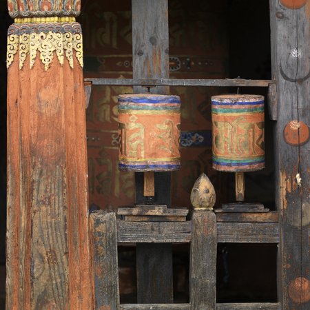 Prayer wheels at Jambay Lhakhang, Chokhor Valley, Bumthang District, Bhutan