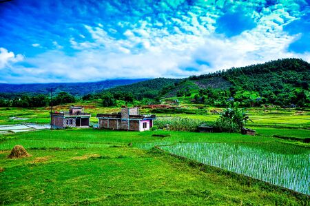 View of cloudy blue sky beautiful villages and rice fields of villagers in Indian states. Green and yellow golden colour crops in India are best destination for travellers.