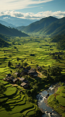 A stunning landscape featuring a river winding through lush valleys, framed by majestic mountains and vibrant autumn foliage, showcasing traditional architecture.