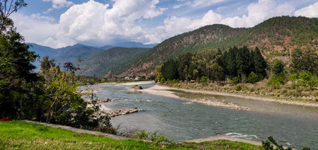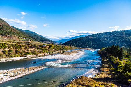Mo Chhu River on a nice sunny day, Punakha, Bhutan. View from the wooden cantilever bridge near Punakha Dzong to river, houses of Punakha city and Himalaya mountains covered with forest.