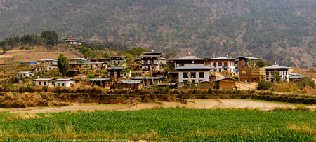 Sopsokha village with rice field at sunny day in Bhutan. Agriculture has a dominant role in Bhutan economy. Most of the population is involved in agriculture.