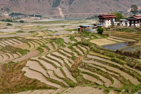 Terraced rice field with rural houses in Bhutan. Bhutan is a small country in the Himalayas between the Tibet Autonomous Region of China and India.