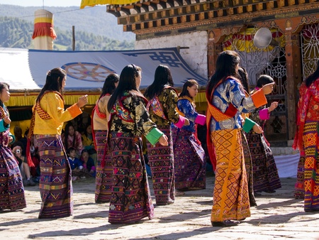 JAKAR, BHUTAN - OCTOBER 24, 2010: Women wearing traditional kira dresses dancing at the Jakar tsechu on Oct. 24, 2010 in Jakar. Tsechu are annual religious Bhutanese festivals, usually around October