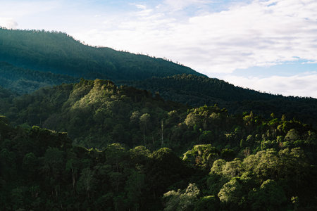 mountains and green trees in the evening.high angle view