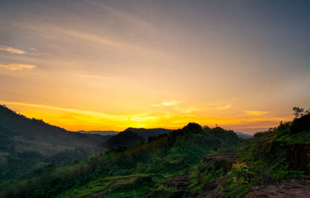 Beautiful nature landscape of mountain range with sunset sky and clouds. Mountain valley in Thailand. Scenery of mountain layer at dusk. Tropical forest. Natural background. Orange and golden sky.