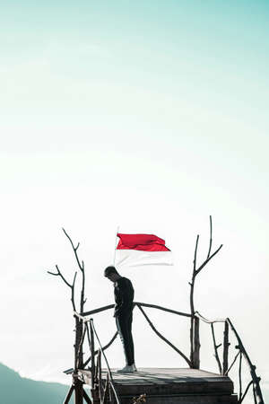 A young man raises the red and white flag, the Indonesian state flag, on a plateau with a blue sky view