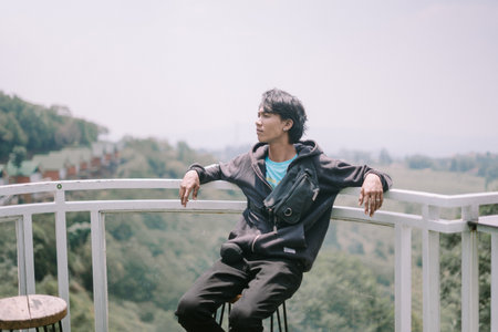 A man sitting on a balcony, enjoying the scenic view in the background, with a calm and relaxed posture