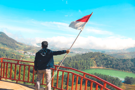 A man with Indonesian flag standing on cliff and enjoying the view of nature of lake and mountain in Dieng Indonesia.