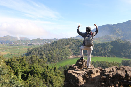 Young man standing on a rock of a cliff and enjoying the view of nature of lake and mountain in Dieng Indonesia.