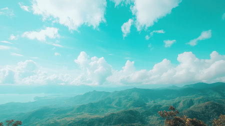 A breathtaking view of rolling mountains under a vibrant turquoise sky, featuring fluffy clouds. This tranquil landscape embodies the serene beauty of nature, perfect for relaxation and adventure.