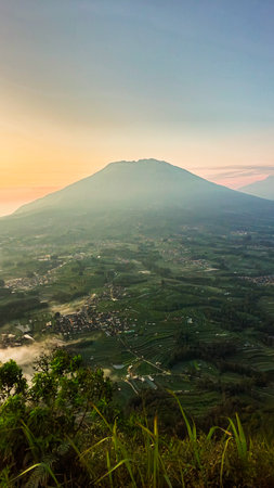 A very beautiful and majestic view of Mount Merbabu from close range at the moment of sunrise from the top of the hill at an altitude of 1800 meters above sea level