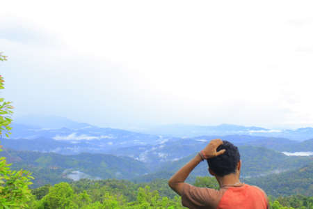 a man sitting and looking away to nature scenic view from viewpoint of Khao Luang Sukhothai, Thailand