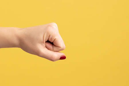 Profile side view closeup of woman hand showing boxing fists with hand, attack or defense against problems. Indoor studio shot isolated on yellow background.