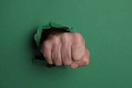 male fist through a hole in paper on a white background isolate. close up, copy space.