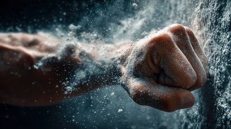 A powerful hand forcefully breaks a fine powdery substance, unleashing an energetic burst of particles that emphasizes strength and impact.