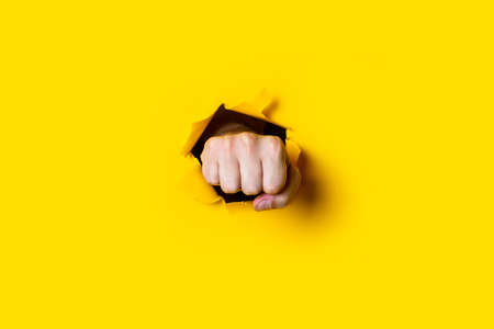 Fist punching through a hole in a ripped white paper