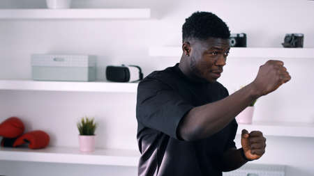 Black guy boxing in the air. Warm-up workout. White shelves mounted on the wall in the background. High quality photo