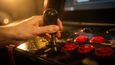 Closeup view of hand grasping a classic joystick bathed in warm light highlighting red buttons and reflective glossy cabinet surface blurred beyond.