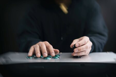 Artisan using hand press for setting snaps in leather for makes a wallet. Hand Pressure Snap Pressing Machine is using by craftsman in leather workshop.
