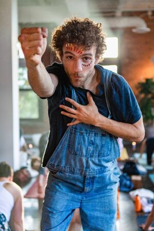 Diverse group of people in yoga class. A Caucasian man with painted face is seen holding his chest with one hand and stretching a fist out with the other during a workshop of 108 sun salutations.