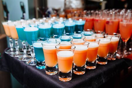 Rows of glasses with alcoholic drinks on the table. Colored beverages in glasses on banquet table.