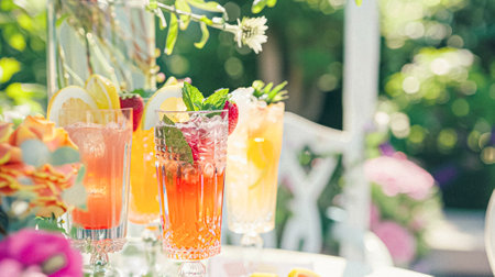 A vibrant array of non-alcoholic drinks displayed in elegant glasses, showcasing colorful ingredients and garnishes, perfect for summer gatherings or parties.