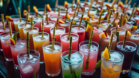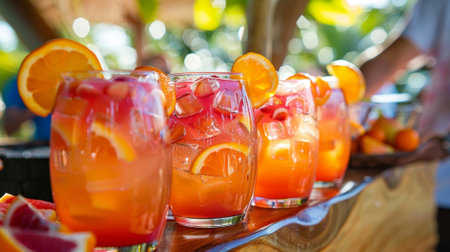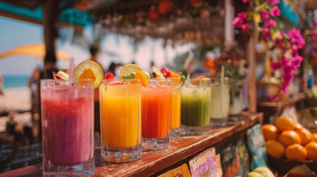 An inviting display of vibrant tropical cocktails captures summer's essence. Perfect for vacation vibes, these refreshing drinks enhance beachside relaxation and enjoyment.