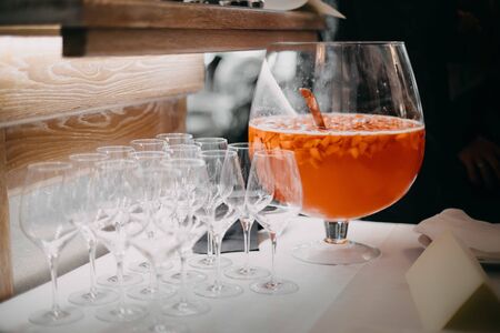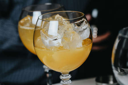 Cocktails with champagne in wine glasses on the bar table in the pub or restaurant with the bartender.