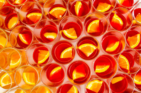 Many glasses of fresh alcoholic welcome drinks with pieces of oranges