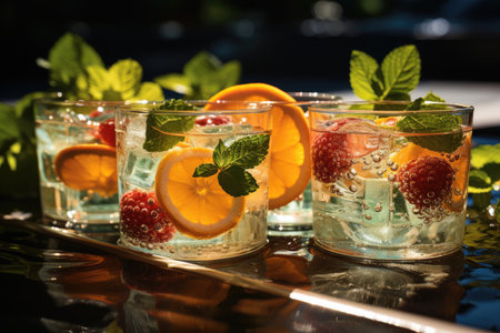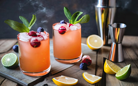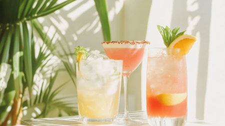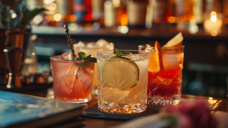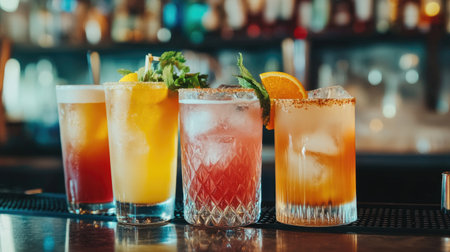 A set of delicious, refreshing cocktails sitting on a bar counter, with vibrant colors and fresh ingredients